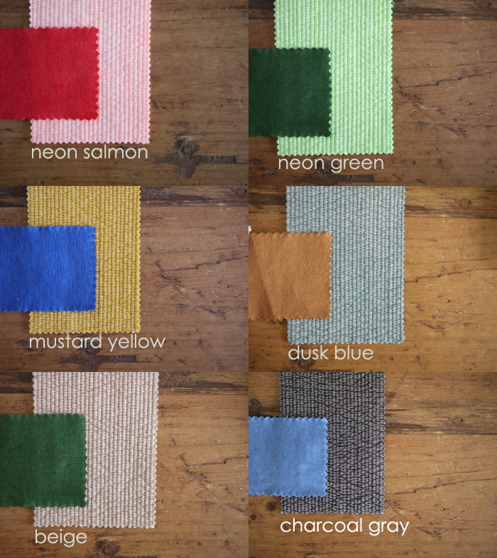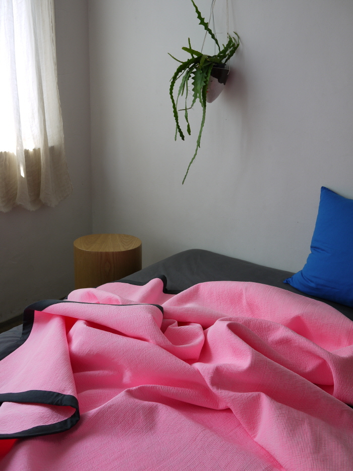 네온 핑크 퀼티드 인견과 차콜 린넨을 조합해 만들었어요.