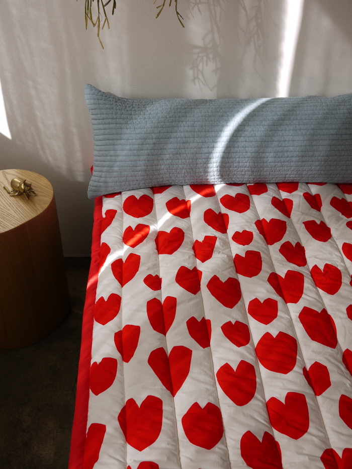 화이트 바탕에 빨간 하트가 프린팅된 사랑스러운 패브릭이에요.